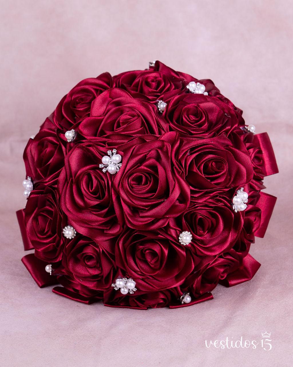 Este elegante ramo de flores eternas para 15 años es el complemento ideal para tu vestido de quinceañera. Confeccionado con delicadas rosas de tela de satén en rojo vino, su diseño sofisticado está decorado con apliques plateados y perlas, aportando un brillo único y un estilo distinguido. Más que un accesorio, es un ramo recuerdo que podrás conservar para siempre como símbolo de tu celebración especial.