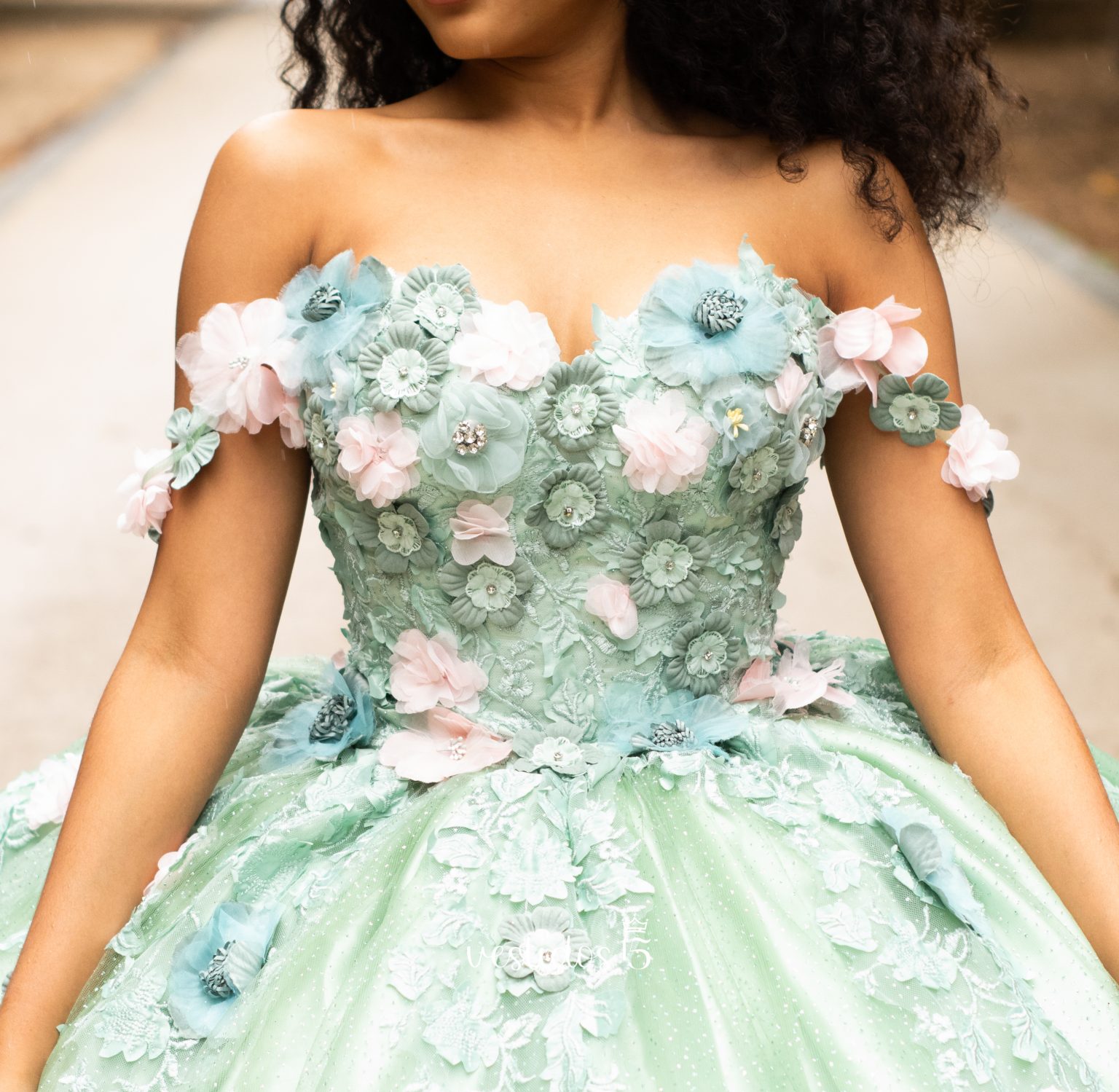 Transforma tu sueño de quinceañera en realidad con este impresionante vestido. Un diseño de ensueño en un delicado tono verde agua, perfecto para una celebración inolvidable. Su corte princesa realza la figura, mientras que el escote bardot adornado con flores crea un look romántico y sofisticado.