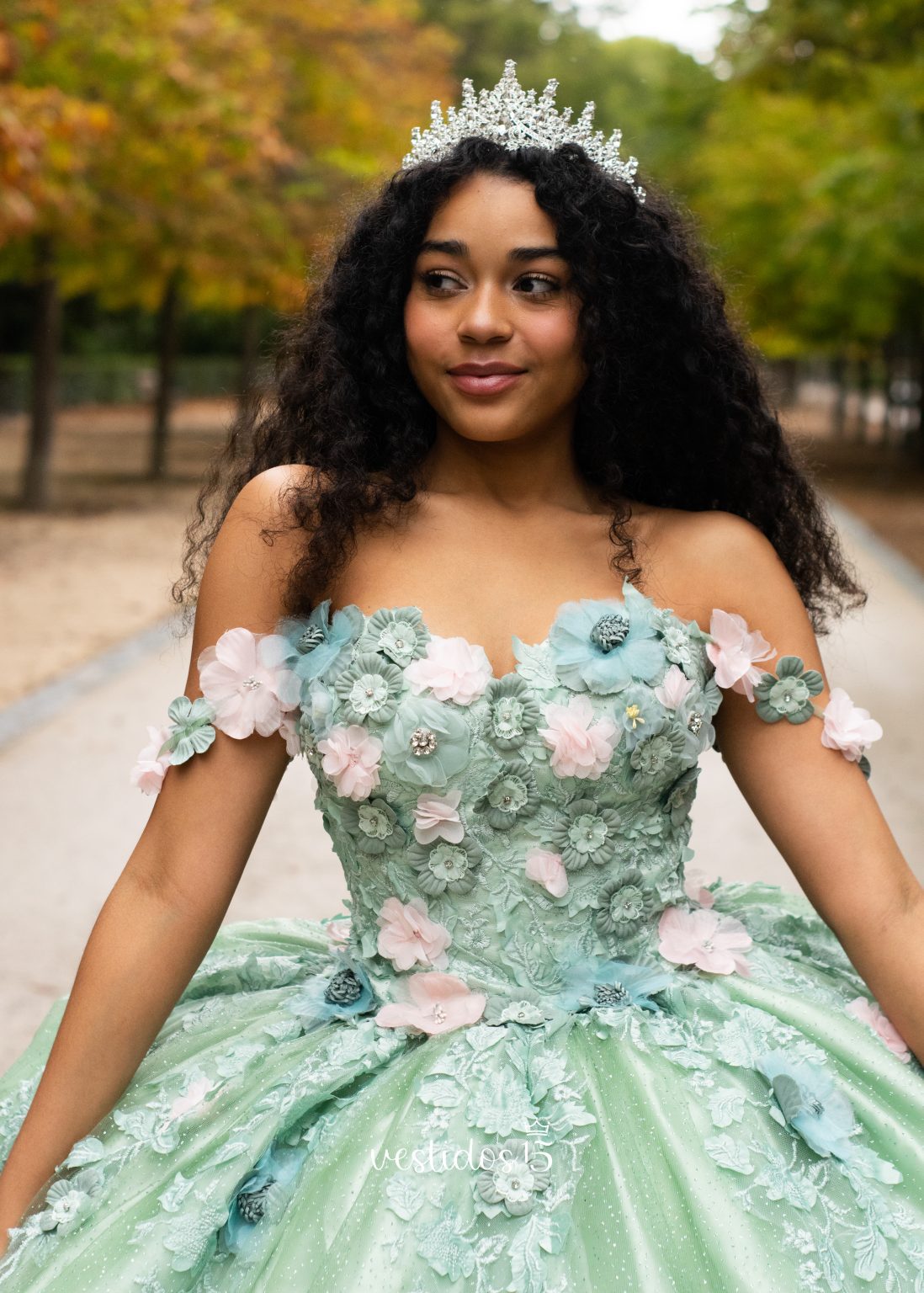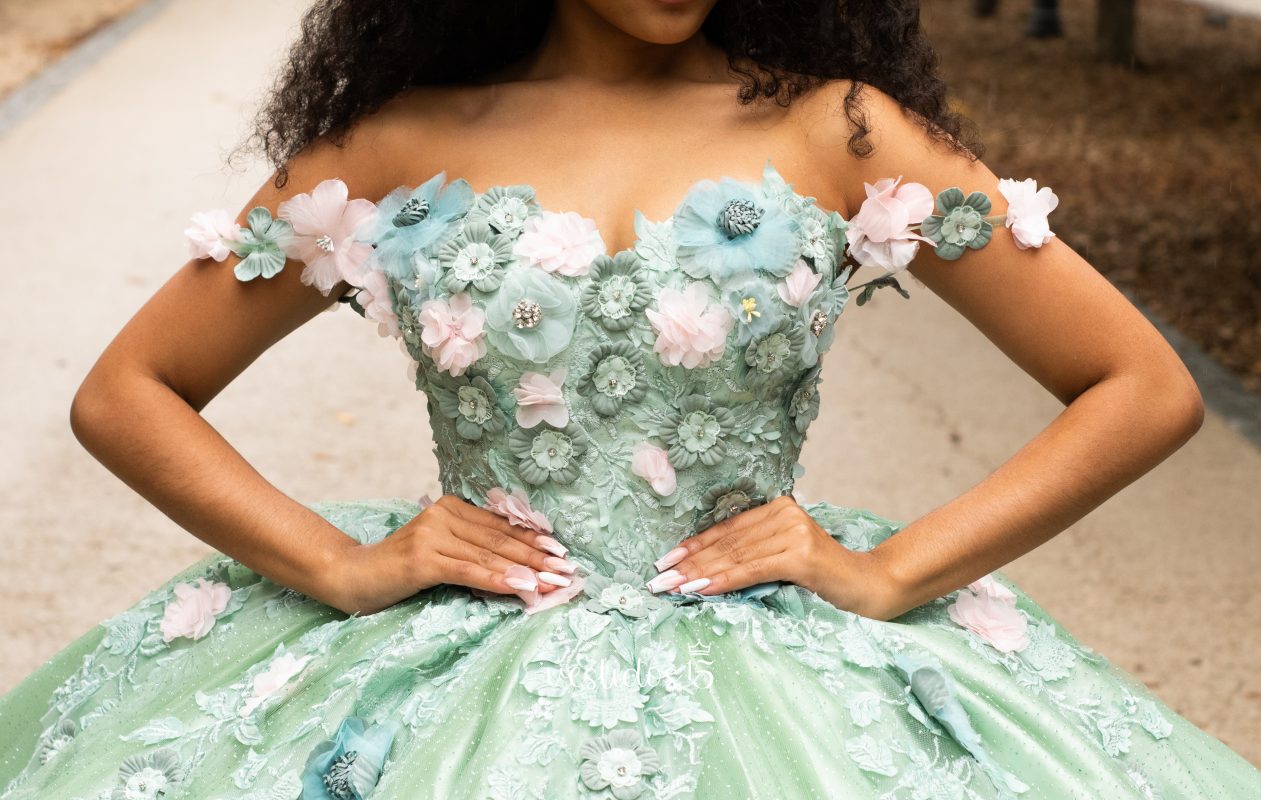 Los detalles de encaje floral bordados a mano a lo largo de la falda añaden un toque de magia y distinción. Cada detalle de este vestido ha sido cuidadosamente pensado para que te sientas como la protagonista de tu propio cuento de hadas. ¡Haz que tu quinceañera sea un evento mágico e inolvidable!